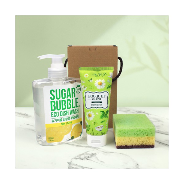 | 기타사항 | 슈가버블 주방세제 용기 470ml + 부케가르니 캐모마일 핸드크림 100ml + 떡수세미 + 끈케이스 스티커 제작 및 부착 별도문의 |