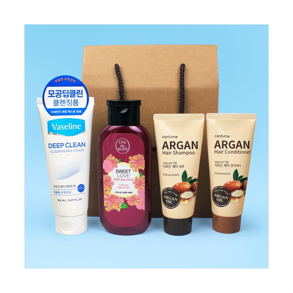 | 기타사항 | 바세린 클렌징폼150ml + LG온더바디 바디워시190ml + 과일나라 아르간 샴푸100g+컨디셔너100g + 끈케이스 스티커 제작 및 부착 문의 |