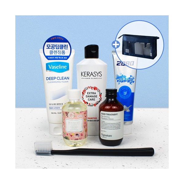 | 기타사항 | 애경 바세린 클렌징폼+케라시스 샴푸+2080 퓨어치약+부케가르니 바디워시+NARD 트리트먼트+미세모칫솔+에코파우치 에코파우치 실크1도 인쇄 별도문의 종이케이스 추가 별도문의 |