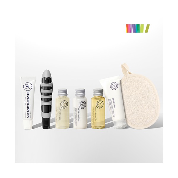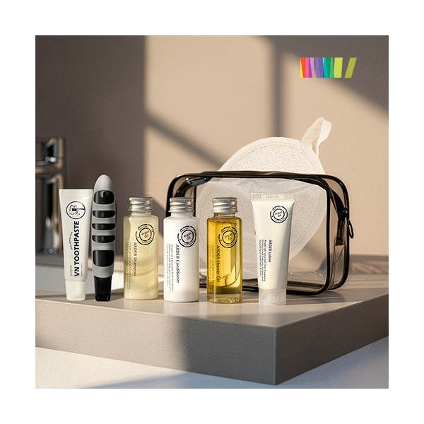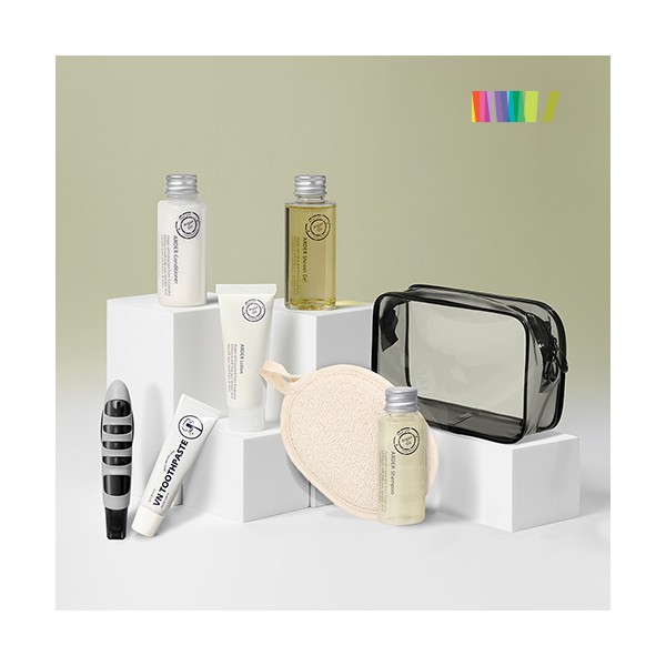 | 규격 | 삼푸30ml, 컨디셔너30ml, 샤워젤30ml, 로션30ml, 치약20g, 샤워패드(140*100mm),파우치(165*115*40mm), 종이케이스(180*35*130mm) | 색상 | 상세페이지 참조 |