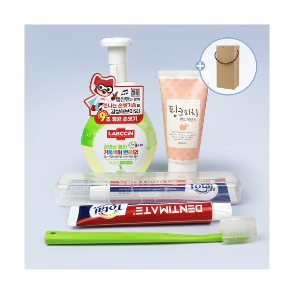 | 기타사항 | 애경 랩신 핸드워시 + 과일나라 핑크피치 핸드로션 + 크리오 미세모칫솔 + 덴티메이트 치약 + 휴대용케이스 + 끈케이스 치약칛솔세트 스티커 제작 및 부착 별도문의 |