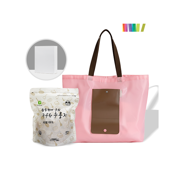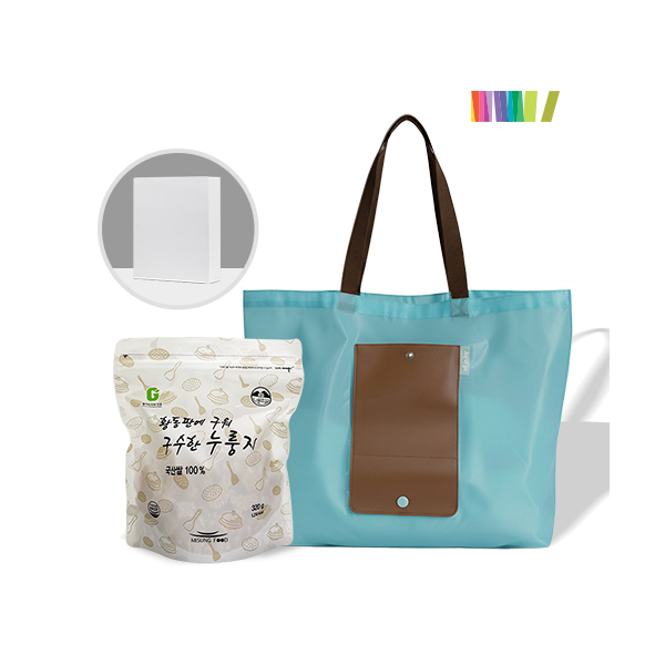 | 인쇄 | 1도 실크인쇄(장바구니, 종이케이스 중 1곳 인쇄) | 재질 | 누룽지(국산쌀 100%), 레더포켓 장바구니(폴리에스테르,PVC) |