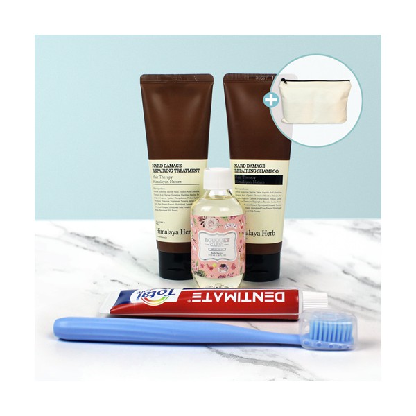 | 기타사항 | Nard 튜브형 샴푸 + 트리트먼트 + 바디워시 + 미세모칫솔 + 덴티메이트 치약 + 에코파우치 종이케이스 추가 별도문의 에코파우치 실크1도인쇄 별도문의 |
