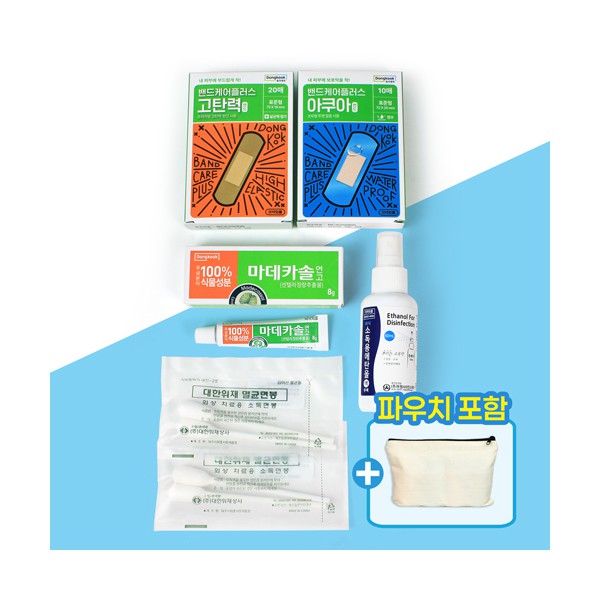 | 기타사항 | 동국제약 고탄력밴드 10매 + 아쿠아 방수밴드 10매 + 마데카솔 연고 8g + 소독용 에탄올 스프레이 + 상처 처치용 멸균면봉 + 에코파우치 + 종이케이스 추가 별도문의 에코파우치 실크1도 인쇄 별도문의 종이케이스 추가 별도문의 |