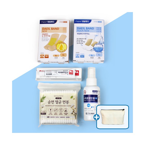 | 기타사항 | 정품 대일밴드 오리지널 표준8매 대형4매 + 방수밴드 표준8매 대형4매 + 마데케어연고 5g + 멸균면봉100매 + 에탄올 소독 스프레이 + 에코파우치 에코파우치 실크1도 인쇄 별도문의 종이케이스 추가 별도문의 |