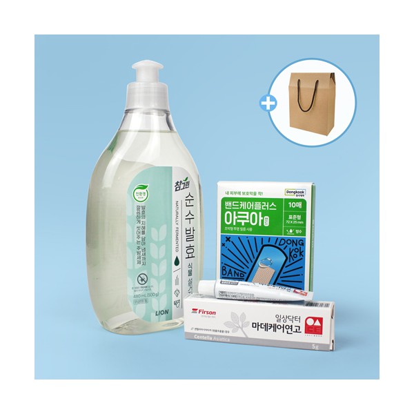 | 기타사항 | 참그린 순수발효 주방세제 480ml + 마데케어 연고 5g + 동국제약 아쿠아 방수밴드 10매 + 끈케이스 케이스 이미지 변경 가능, 상세페이지 참조 (어려운이웃 복지사각 / 치매예방 / 금연홍보 / 슬기로운 안전생활) 스티커 제작 및 부착 별도문의 케이스 실크1도인쇄 별도문의 |