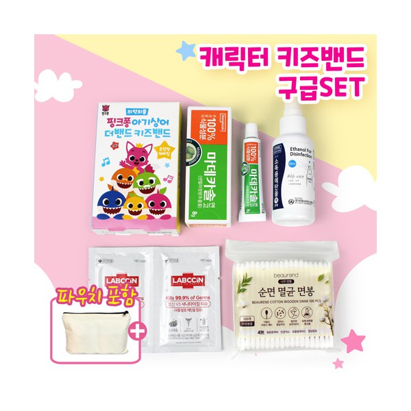 | 기타사항 | 핑크퐁 키즈밴드 혼합형 16매 + 마데카솔 연고 + 스프레이형 소독제 + 순면 멸균면봉100매 + 애경 랩신 손소독티슈 + 에코파우치 에코파우치 실크1도 인쇄 별도문의 종이케이스 추가 별도문의 |