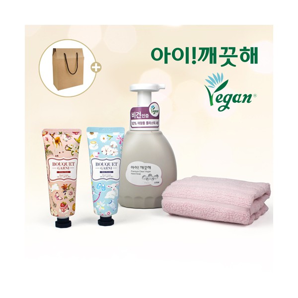 | 기타사항 | 핸드워시 아이깨끗해 프리미엄 클린 비건 450ml + 부케가르니 핸드크림 2개 + 순면 골지 핸드타올 고리타올 + 끈케이스 스티커 제작 및 부착 별도문의 케이스 실크1도인쇄 별도문의 케이스 이미지 변경 가능, 상세페이지 참조 (어려운이웃 복지사각 / 치매예방 / 금연홍보 / 슬기로운 안전생활) |