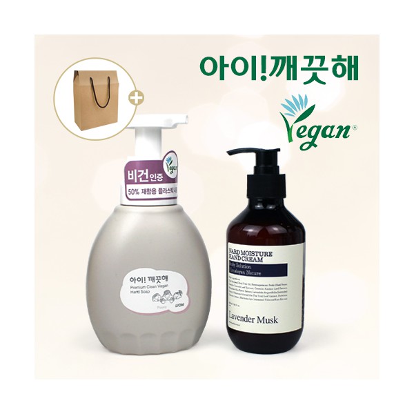 | 기타사항 | 핸드워시 아이깨끗해 프리미엄 클린 비건 450ml + Nard 나드 핸드크림 280ml 2종세트 + 끈케이스 + 케이스 이미지 변경가능 케이스 이미지 변경 가능, 상세페이지 참조 (어려운이웃 복지사각 / 치매예방 / 금연홍보 / 슬기로운 안전생활) 스티커 제작 및 부착 별도문의 케이스 실크1도인쇄 별도문의 |