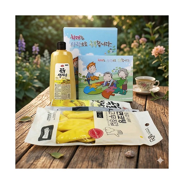 | 기타사항 | 치매예방 주방 위생장갑50매 + 애경 곡물설거지 주방세제 500ml + 주방세제 리필 + 니트릴장갑 10매 + 면코팅고무장갑 + 치매예방 홍보 케이스+케이스 변경 가능 케이스 이미지 변경 가능, 상세페이지 참조 (무지케이스 / 어려운이웃 복지사각 / 치매예방 / 금연홍보 / 슬기로운 안전생활) 스티커 제작 및 부착 별도문의 |
