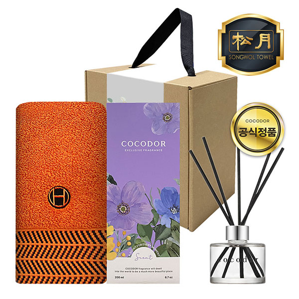 송월타월1장, 코코도르 디퓨저 1개, 일체형 손잡이박스, 속지, 감사스티커(랜덤)