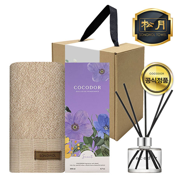 송월타월1장, 코코도르 디퓨저 1개, 일체형 손잡이박스, 속지, 감사스티커(랜덤)