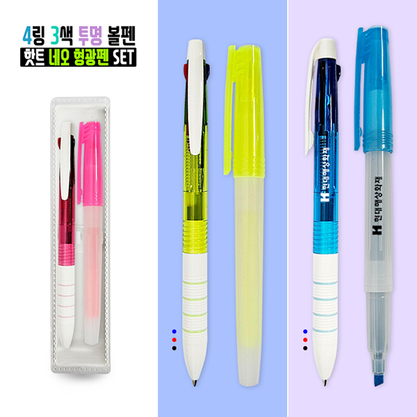 4링3색 투명볼펜+핫트 네오 형광펜 세트